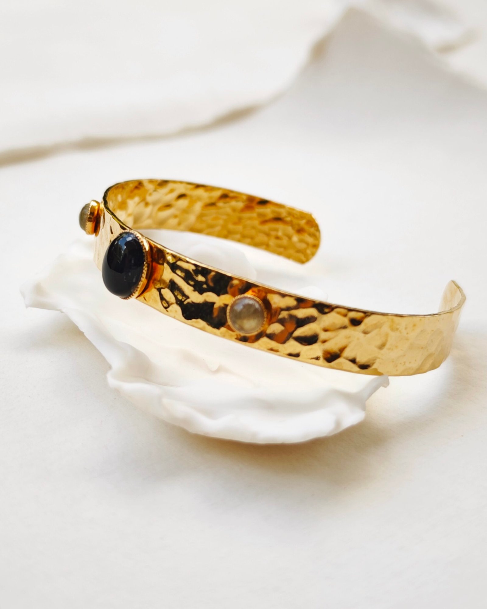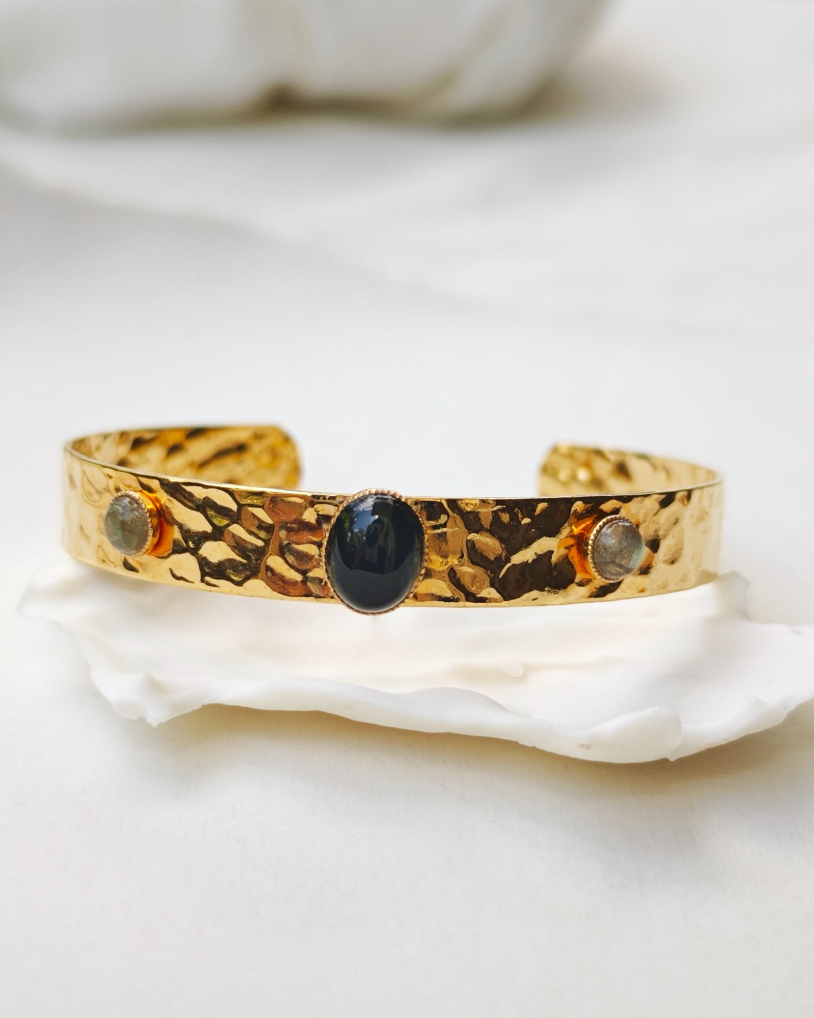 – Plaqué or 3 microns 24 carats sur une base en laiton. – Pierre obsidienne et labradorite